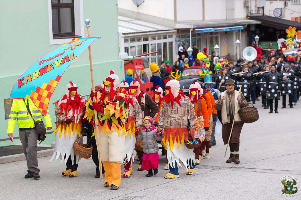 Na začetku sprevoda je kraljeval petelin, ki je včeraj od župana prevzel ključ mestnih vrat. Sledili so maskirani Pihalni orkester Tržič, hudiči, Nodi z družino, Sneguljčica in njenih sedem palčkov, klovni, gasilci s Samotom na čelu in še veliko zanimivih in domiselnih mask.