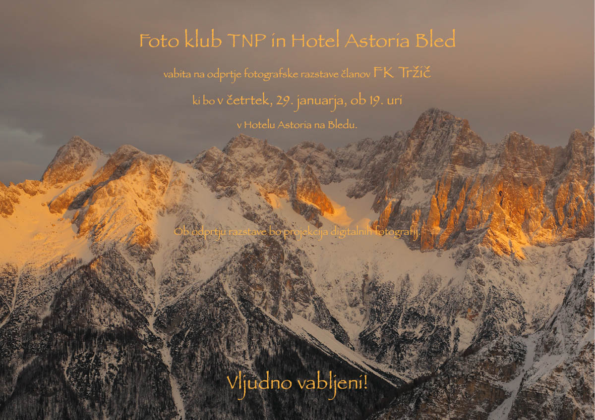 Na povabilo Foto kluba Triglavskega narodnega parka Bled je Foto klub Tržič pripravil prvo letošnjo razstavo fotografij v prostorih hotela Astoria na Bledu. Otvoritev razstave je bila v četrtek 29.1.2014 ob 19. uri, tema razstave pa je Naša Gorenjska. Na razstavi sodeluje 15 avtorjev s po dvema fotografijama. Razstava je skupinska in fotografije niso označene z imeni avtorjev, se pravi, da so avtorji „incognito“.