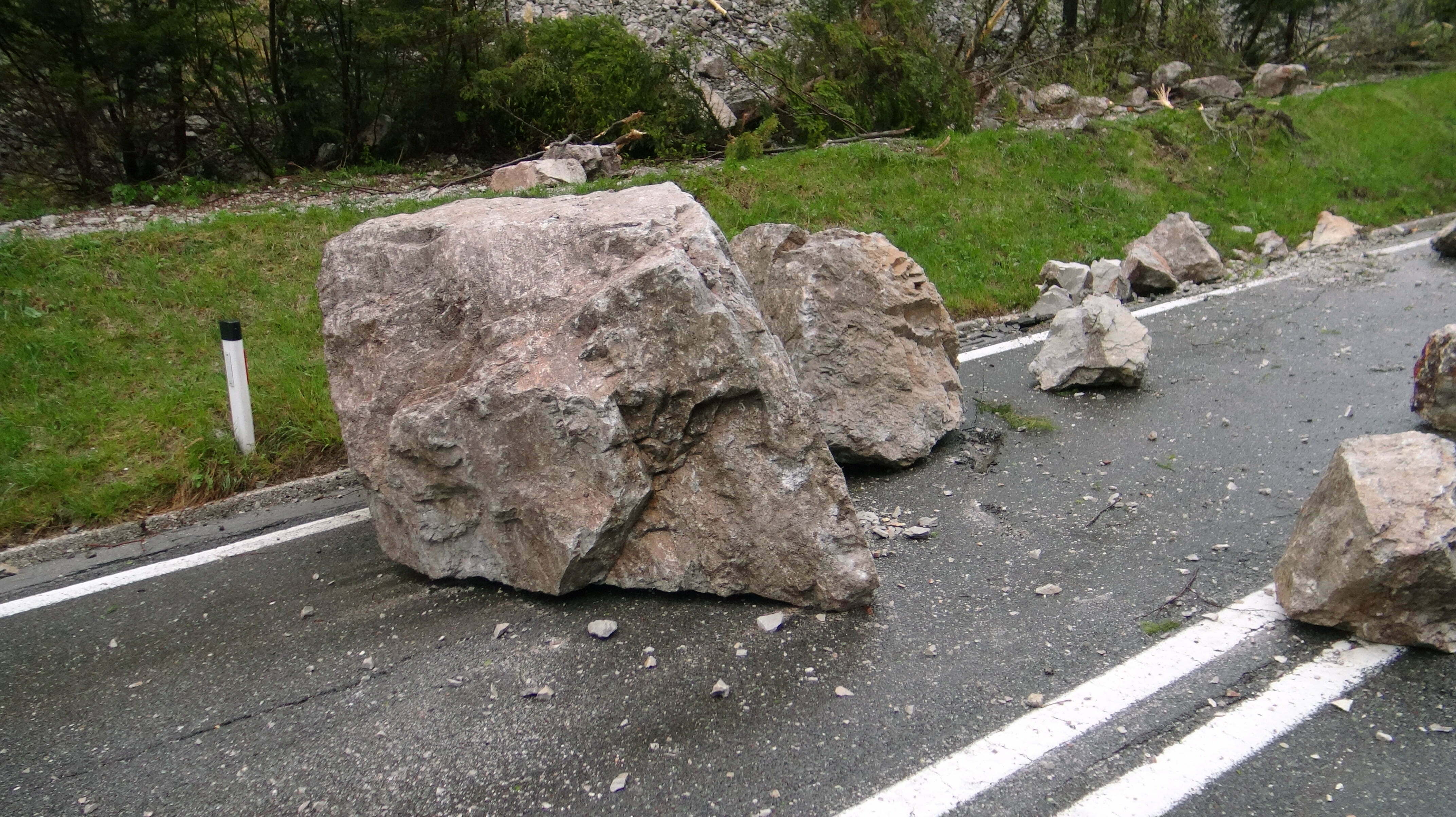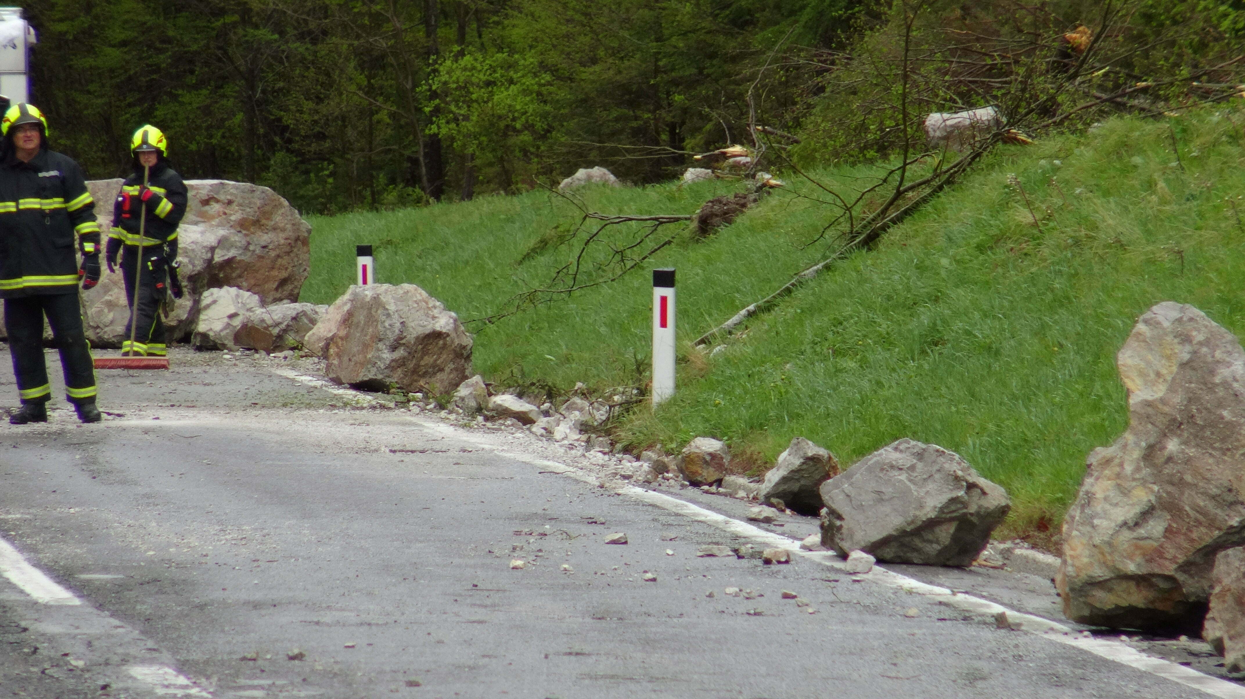 Na cesti, ki je na krajšem odseku močno poškodovana, pa so ostale tudi še velike skale.